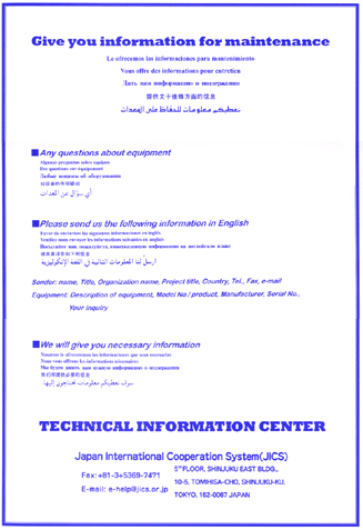The Technical Information Center will only answer inquiries relating to equipment to which a sticker is attached; it may not answer inquiries relating to other equipment.